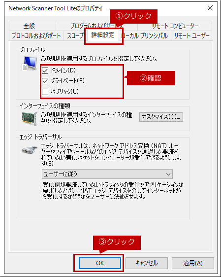 9. 次に「詳細設定」タブを選択して、プロファイル欄の[ドメイン(D)]と[プライベート(P)]にチェックされていることを確認して、[OK]をクリックしてください。