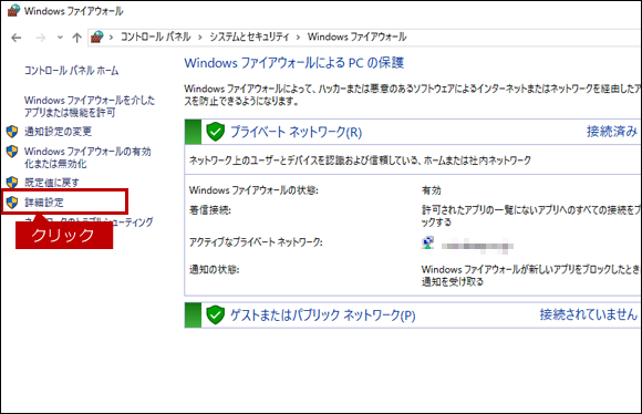 4. 「Windowsファイアウォール」画面が表示されますので、[詳細設定]をクリックしてください。