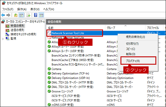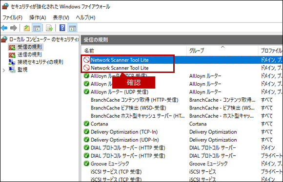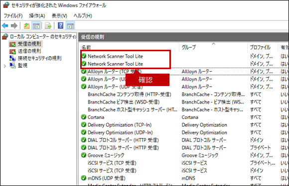 6. 「受信の規則」の一覧が表示されますので、「Network Scanner Tool Lite」が無効になっていることを確認してください。