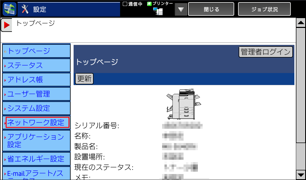 (表示されたWeb管理画面では、複合機の状態確認や設定・変更が可能です。)
