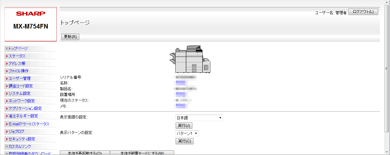 (表示されたWeb管理画面では、複合機の状態確認や設定・変更が可能です。)