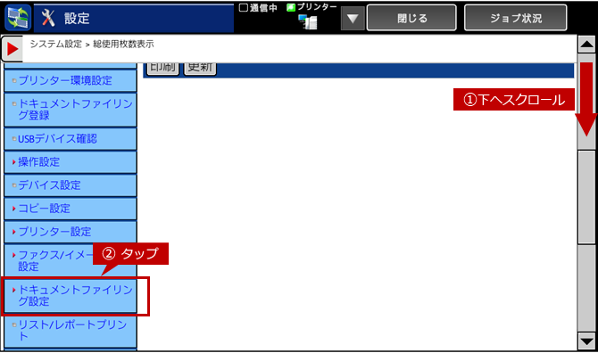 3.システム設定画面が表示されますので、ページを下にスクロールして、[ドキュメントファイリング設定]をタップしてください。