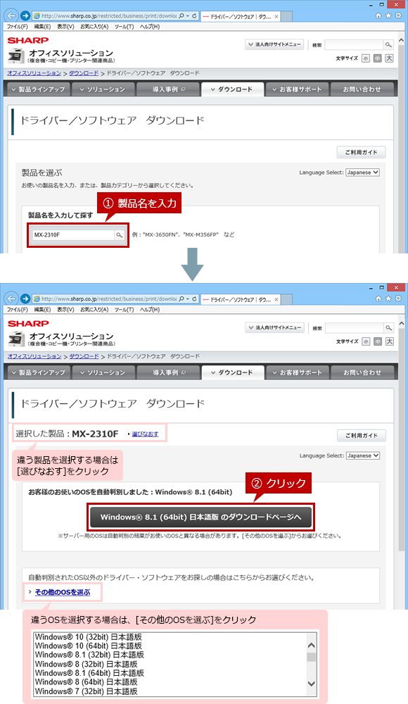 お使いのOSと異なる場合は「 > その他のOSを選ぶ 」をクリックし、リストボックスからお使いのOSを選択してください。