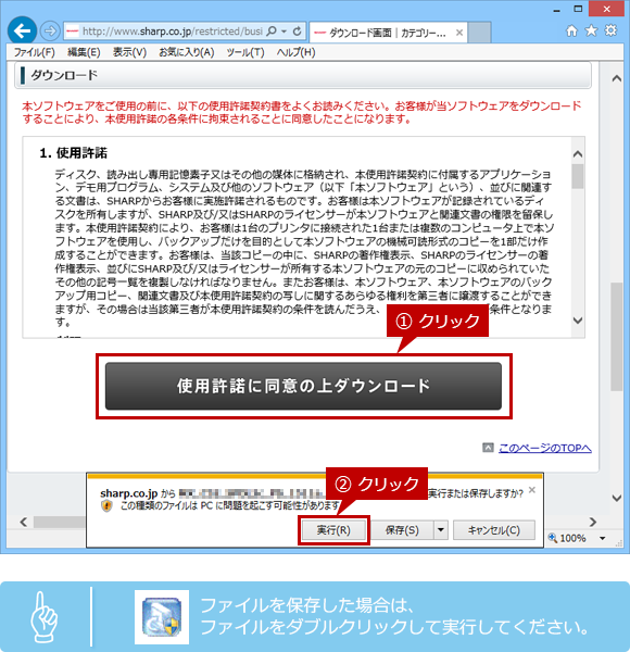 [使用許諾に同意の上ダウンロード]ボタンをクリックし、表示されたウィンドウにある[実行]ボタンをクリックします。