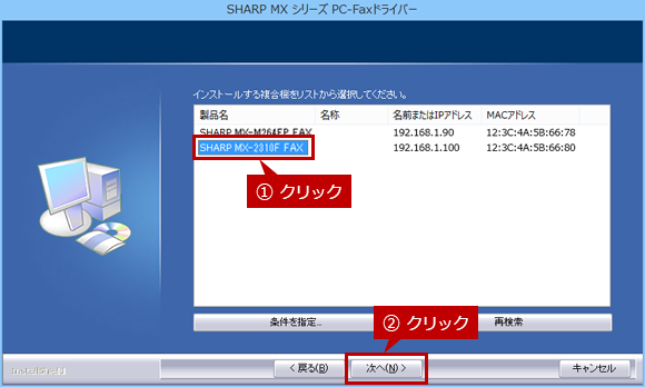 検索された複合機からインストールする複合機を選択し、[次へ]ボタンをクリックします。