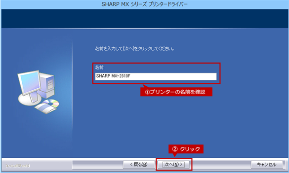 プリンターの名前を確認し、[次へ]ボタンをクリックします。