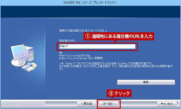 遠隔地にある複合機のURLを入力し、[次へ]ボタンをクリックします。