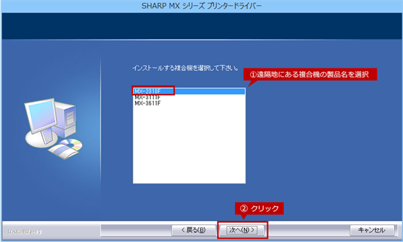 遠隔地にある複合機の製品名を選択し、[次へ]ボタンをクリックします。