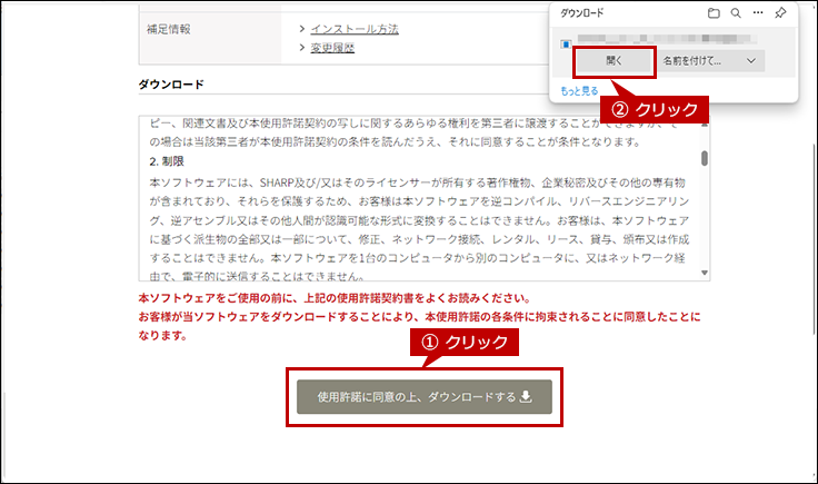 [使用許諾に同意の上、ダウンロードする]ボタンをクリックし、表示されたウィンドウにある[開く]ボタンをクリックします。