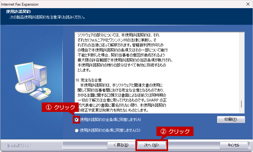 表示された「使用許諾契約」を確認し、「使用許諾契約の全条項に同意します」にチェックを入れ、[次へ」をクリックします。