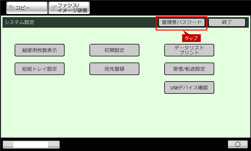 2.「システム設定」画面が表示されますので、[管理者パスワード]をタップします。