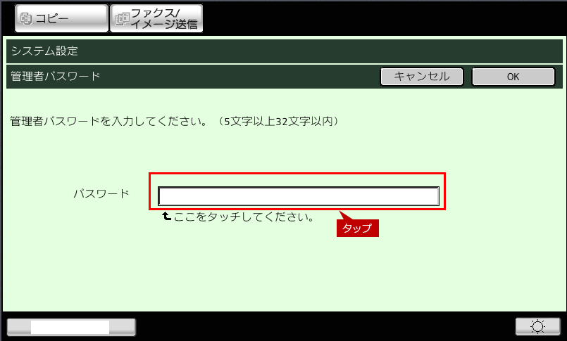 3.管理者パスワード」画面が表示されますので、パスワードを入力し[OK]を押します。