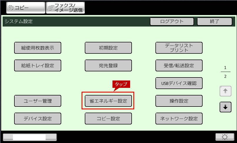 省エネモードの設定は、システム設定の「省エネルギー設定」画面で変更することができます。
