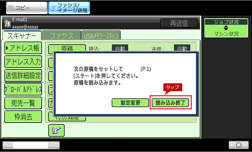 8.「次の原稿をセットして[スタート]を押してください。原稿を読み込みます。」が表示されますので、次の原稿がある場合は原稿を入れ替えて[スタート](本体ボタン)を押します。次の原稿が無い場合は[読み込み終了]をタップします。