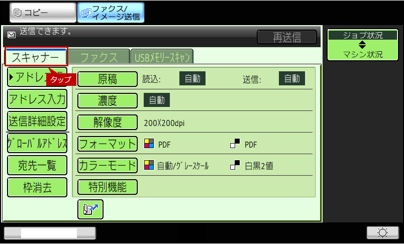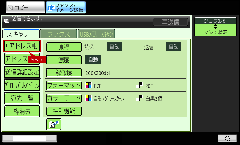 4.スキャナー基本画面が表示されますので、[アドレス帳]をタップします。