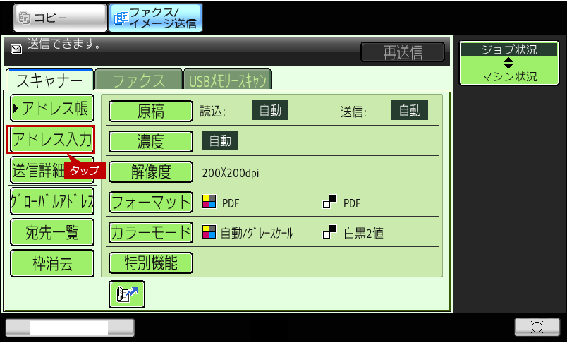 4.スキャナー基本画面が表示されますので、[アドレス入力]をタップします。