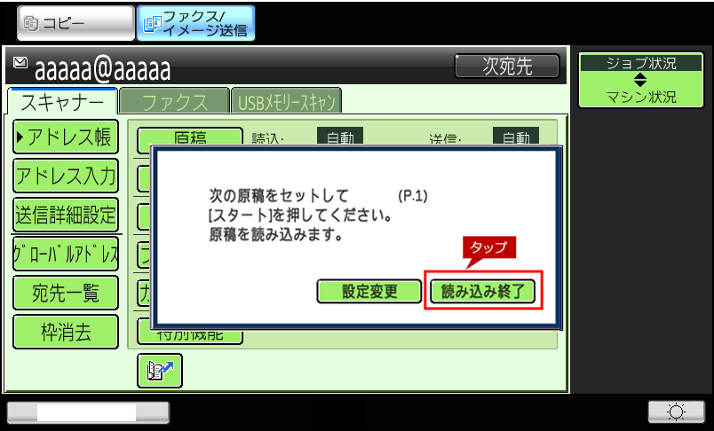 10.「次の原稿をセットして[スタート]を押してください。原稿を読み込みます。」が表示されますので、次の原稿がある場合は原稿を入れ替えて[スタート](本体ボタン)を押します。次の原稿が無い場合は[読み込み終了]をタップします。