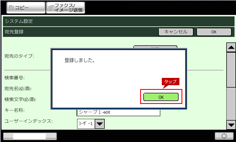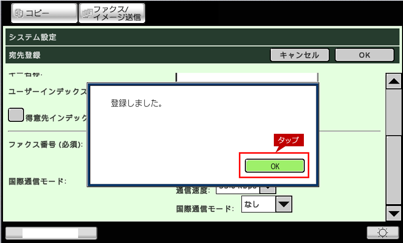 4.「登録しました。」の画面が表示されますので、[OK]をタップします。