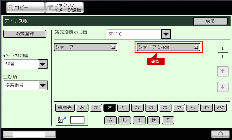 4.「アドレス帳」画面に戻りますので、編集した宛先が表示されていることを確認します。