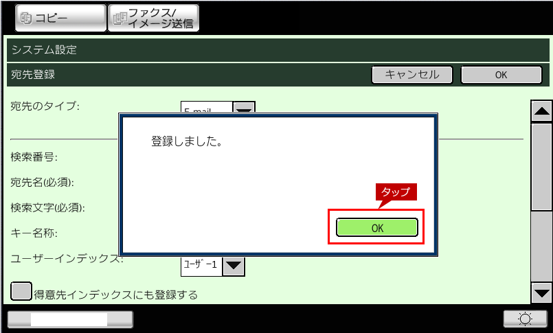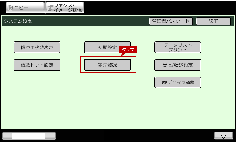 2.「システム設定」画面が表示されますので、[宛先登録]をタップします。