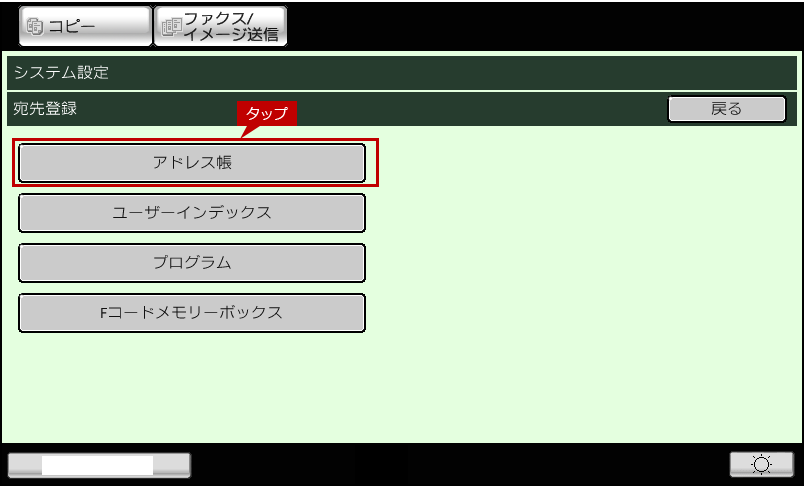 アドレス帳に宛先を新規登録するときや、登録済みの宛先を変更したり、削除するときは、システム設定の「宛先登録」から「アドレス帳」画面を表示してください。
