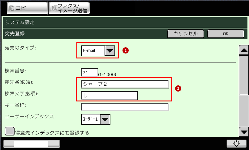 2.①「宛先のタイプ」欄で「E-mail」を選択し、②「宛先名(必須)」「検索文字(必須)」を入力します。
