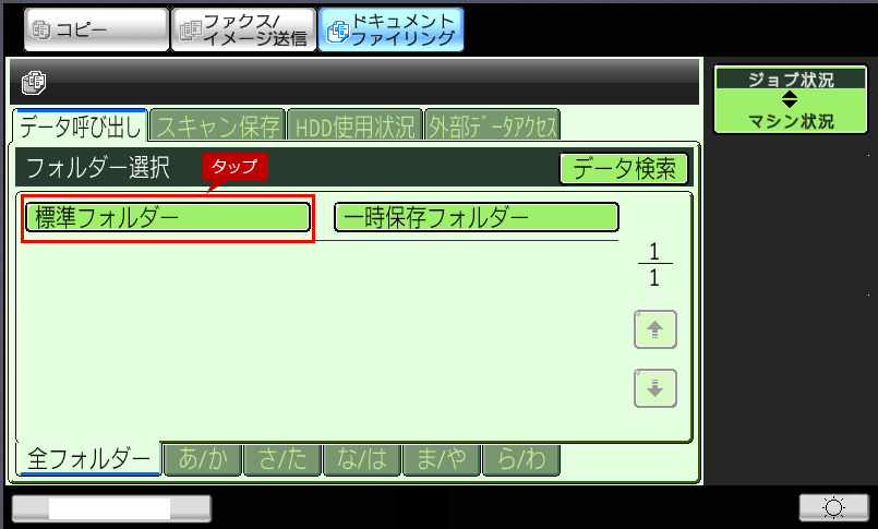 ※「標準フォルダー」と「一時保存フォルダー」に保存されるデータの違いについては、ユーザーズマニュアルの「ドキュメントファイリングについて」をご覧ください。