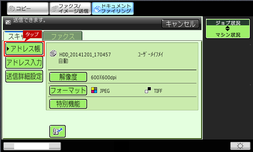 5.送信設定画面が表示されますので、[アドレス帳]をタップします。