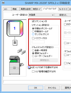 ※([ジョブハンドリング]タブ→「リテンション設定」でプリント→複合機にプリントデータを保存)