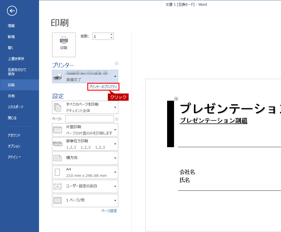 1.アプリケーション(例:Word文書-Office2013-)で[印刷]を押し、