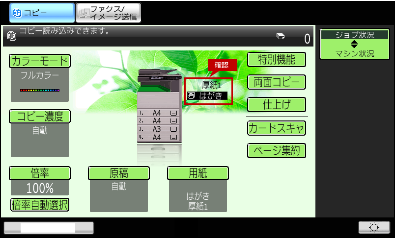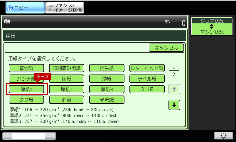7.コピー基本画面で「用紙タイプ」が「厚紙1」になっていることを確認します。