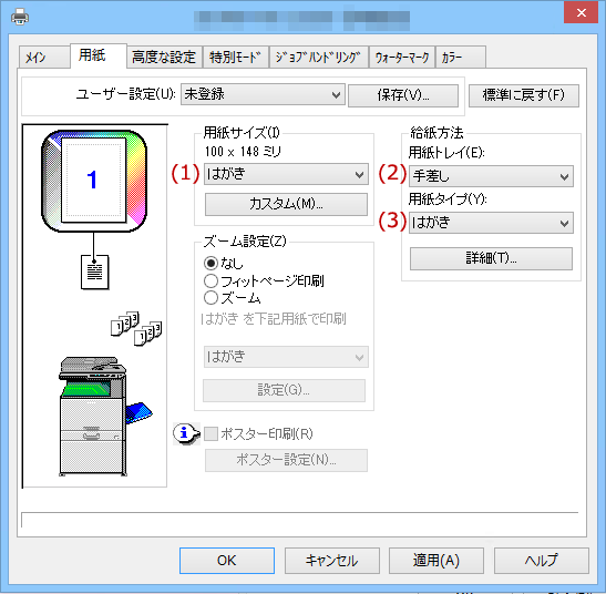 - (3)「用紙タイプ(Y):」:「はがき」