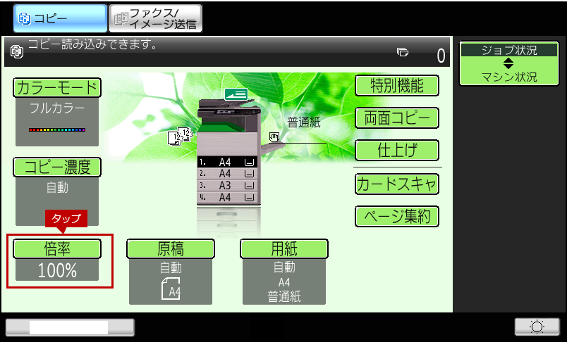 2. コピー基本画面の[倍率]をタップします。