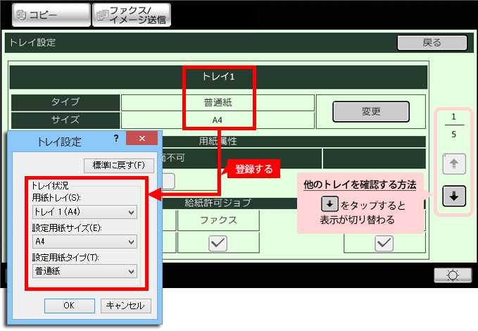 矢印ボタンでトレイを切り替え、全ての設定を登録してください。