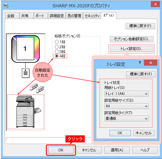 プリンタードライバー / ドライバー / インストール / セットアップ / 設定 / オプション / トレイ / 自動設定 / 手動設定 / Windows