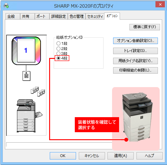 給紙オプションと排紙装置は、装着状態を目視で確認して選択します。
