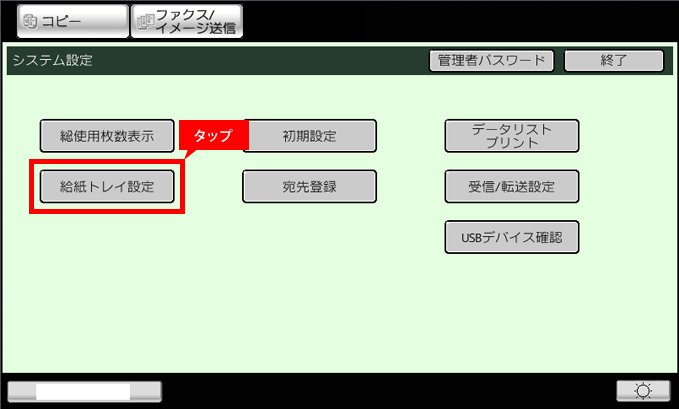 5. タッチパネルでトレイ設定を確認する。