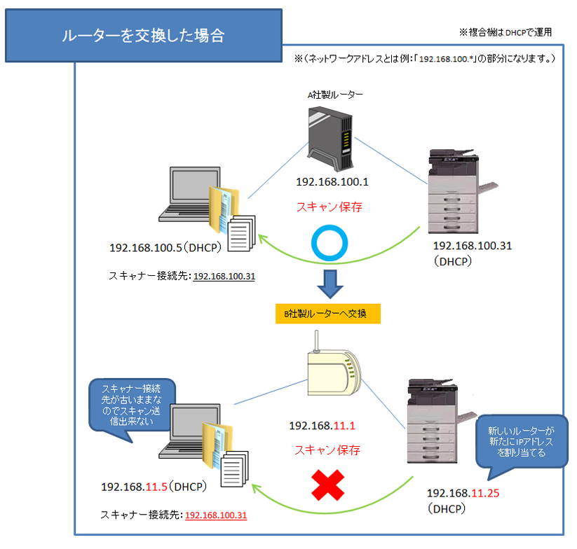 以前使用していたルーターとは違うメーカーのものを使用した場合は、以前とは違うネットワークアドレスを割り当てるケースがよくあります。パソコンと「複合機」には交換したルーターから新しいIPアドレスが配布(設定)されますので、「パソコン」と「複合機」の通信ができない事象が発生する場合があります。