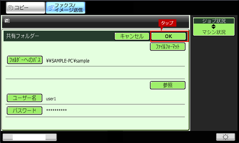 複合機で共有フォルダーを指定する時には、そのユーザーのパスワードが必要になります。