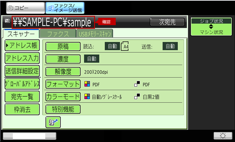 13.「スキャナー」画面に戻りますので、選択した宛先が正しいことを確認します。
