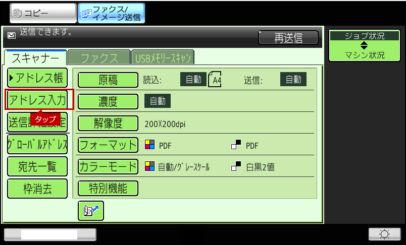 3.「スキャナー」画面が表示されますので、[アドレス入力]をタップします。