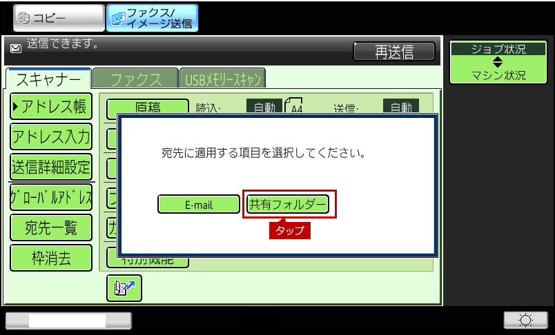 4.「宛先に適用する項目を選択してください。」と表示されますので、[共有フォルダー]をタップします。