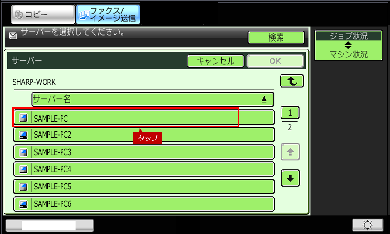 | ワークグループ/サーバー/共有フォルダーの各画面の[検索]ボタンを押して、検索文字を入力すると対象のもののみを各画面の一覧に表示させることができます。※検索文字が「SHARP」の場合は、「SHARP」の完全一致及び部分一致のものが対象になります。(例:「SHARP」、「SHARP-001」など) |