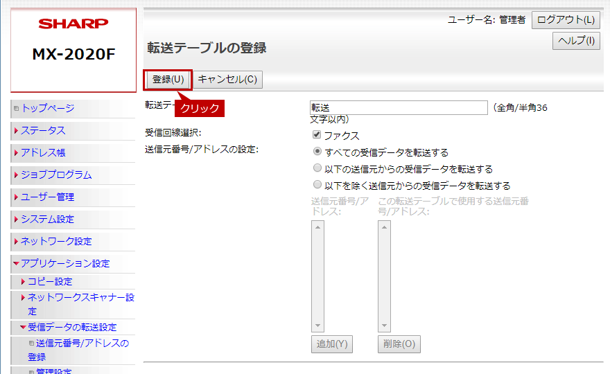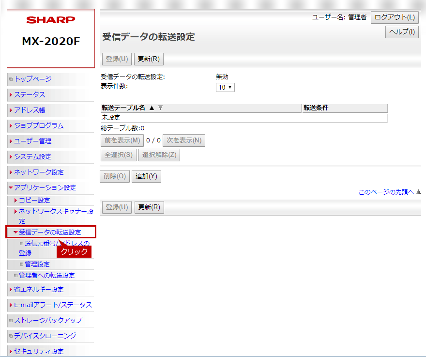 1.メニューリストから管理設定をクリックします。([アプリケーション設定]>[受信データの転送設定]>[管理設定])