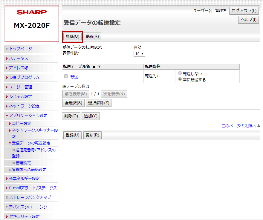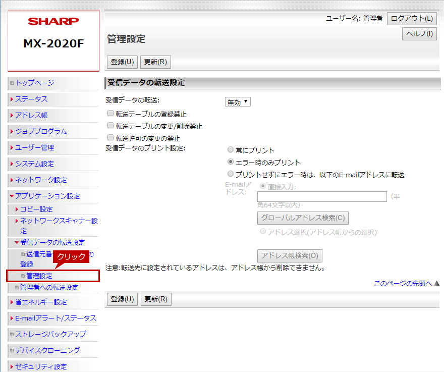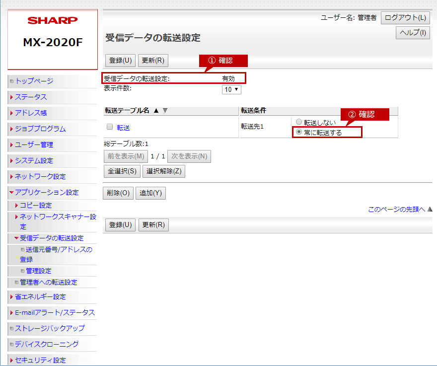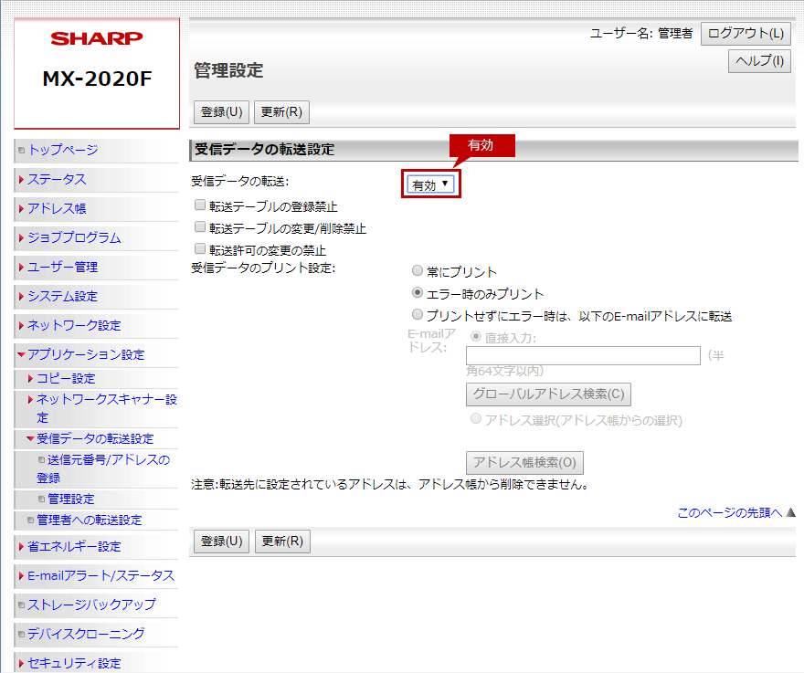 2.「管理設定」画面が表示されますので、「受信データの転送」を「有効」にします。