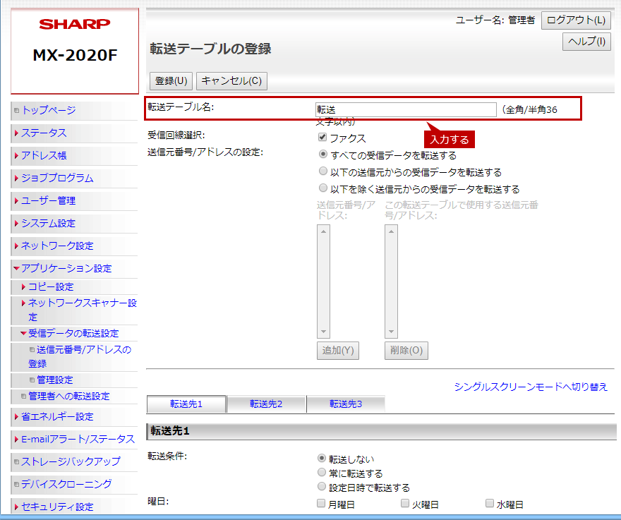 ※転送設定を「有効」にするには、管理者パスワードを入力してログインする必要があります。