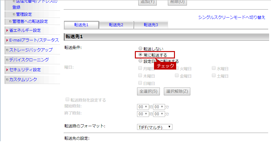 4.ページをスクロールし、転送先1の「転送条件」で[常に転送する]をチェックします。