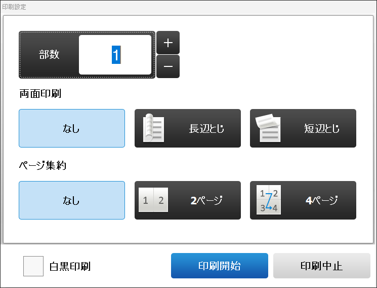 「シンプルUIプラグイン」の「印刷設定」の画面が開きますので、各項目を設定後、[印刷開始]ボタンをクリックします。