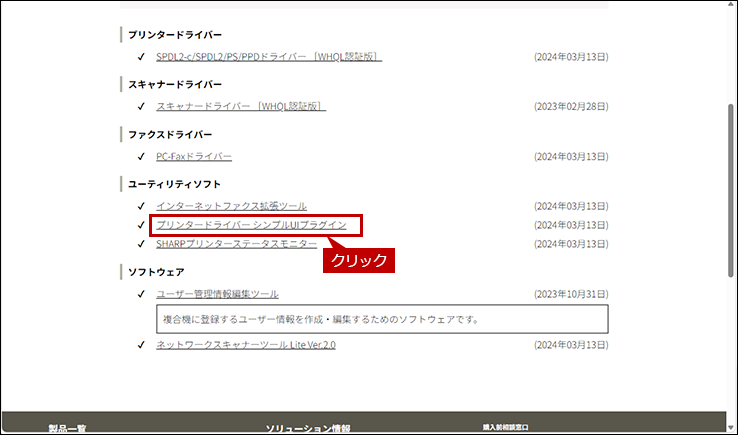 ダウンロード可能なユーティリティーソフトの一覧が表示されますので、「プリンタードライバー シンプルUIプラグイン」をクリックします。