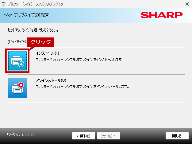 「セットアップタイプの指定」画面が表示されますので、[インストール]アイコンをクリックします。